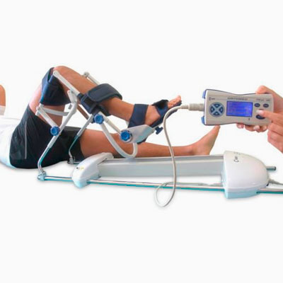 Equipo de movimiento pasivo continuo. CPM utilizado en el proceso de rehabilitación de la rodilla posterior a una cirugía, permite la estimulación del movimiento de los músculos de la pierna, la cadera y la flexión dorsal del pie.